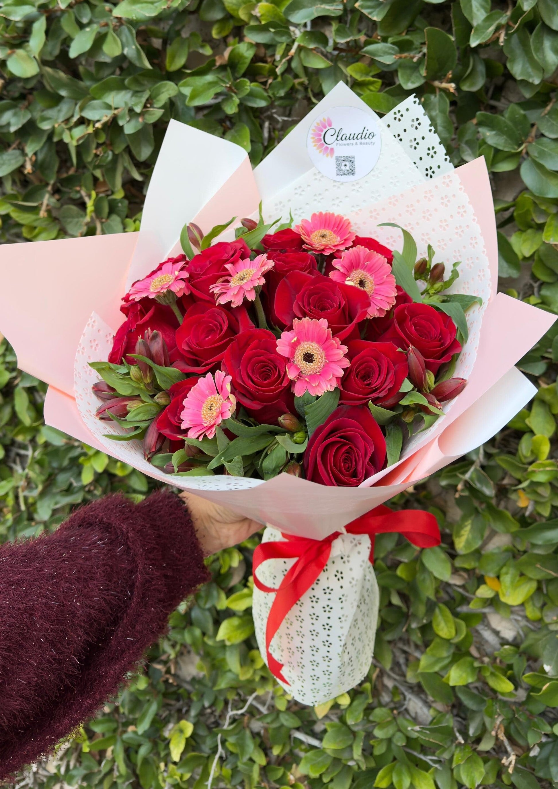 Un ramo romántico y lleno de vida, diseñado para conquistar desde el primer vistazo. Combina la intensidad de las rosas rojas con el toque alegre y delicado de las gerberas rosas, creando un contraste perfecto entre pasión y ternura. Ideal para aniversario, cumpleaños, o simplemente para decir: “me encantas” sin necesidad de palabras.